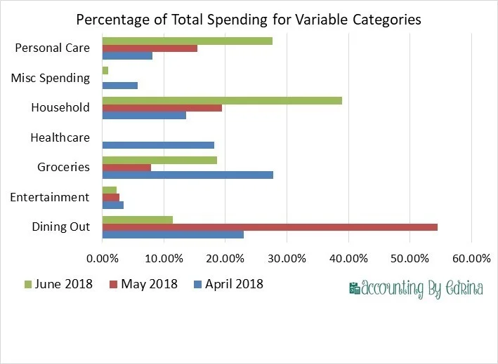 As you can see, May has the highest spending in the dining out line item. When I think back to May, I was really busy and did not have a lot of time for Meal Planning. Take a look at the Groceries line, which is very low for May. In June, I spent a lot of money on Household items. Partially because I needed more items to replenish what I had, and there are a few summer items included in that spending number as well. When I throw my categories into a chart like this it helps visualize where I am spending my money! Then, identify areas of concern and continue to address them moving forward.
